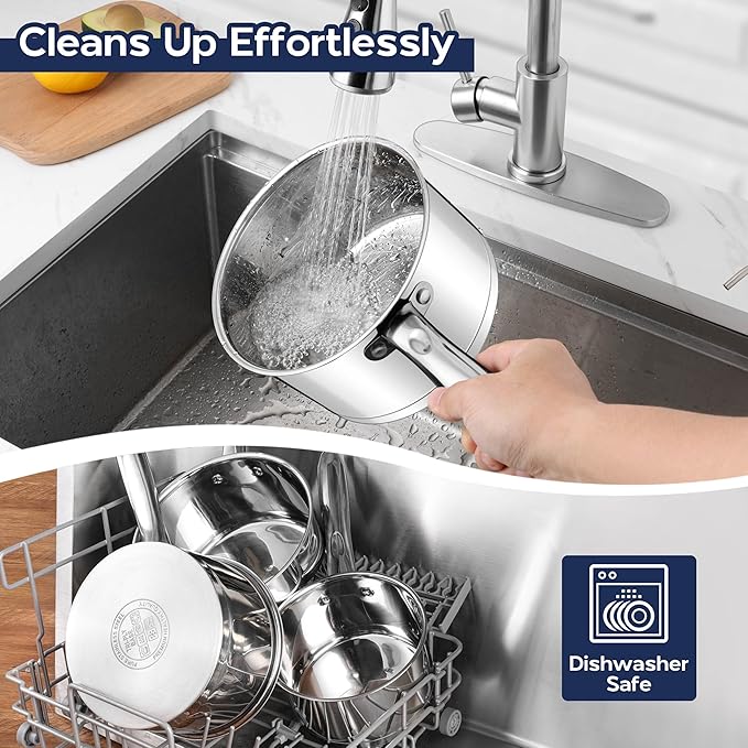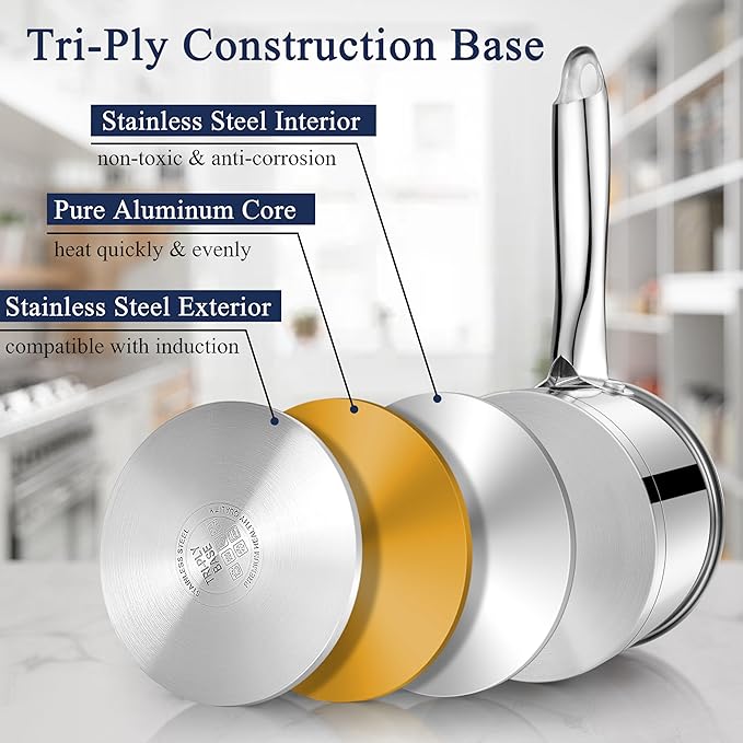• Suitable for all Stovetops: the stainless steel saucepan is constructed of try-ply bottom, with an aluminum core for even heat distribution and quick heating, also compatible with all cooktops, including induction, gas, electric, and ceramic, meets your versatile cooking needs