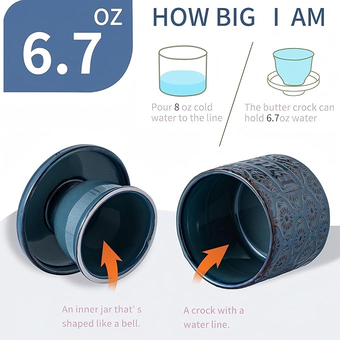 • Useful Butter Keeper Tips: Make sure the lid is clean and dry before use ceramic butter crock. Too soft butter is the most common cause of butter falling into water. Please press firmly with the back of a spoon(Note: the butter needs to touch the porcelain wall without spaces or gaps), It is advisable to refresh the cold bottled or filtered water every 1-2 days.