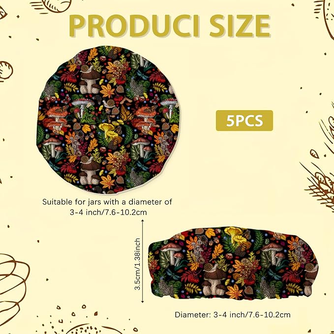 Sourdough Starter Jar Covers,5-Pack Reusable Mushrooms and Leaves Cloth Lids for 3-4 Inch Jars,Ideal for Kombucha Kefir or Cheese Fermentation