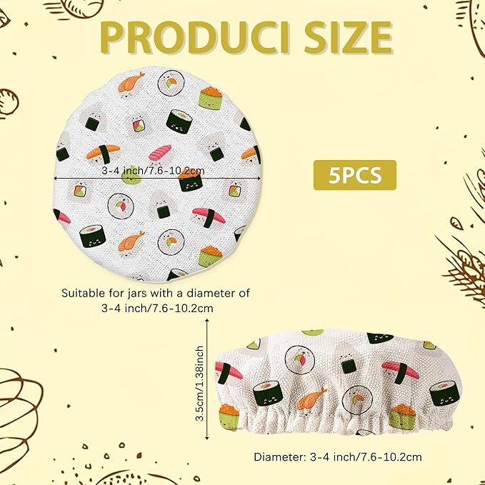 Sourdough Starter Jar Covers,5-Pack Reusable Japaness Sushi Cute Cloth Lids for 3-4 Inch Jars,Ideal for Kombucha Kefir or Cheese Fermentation