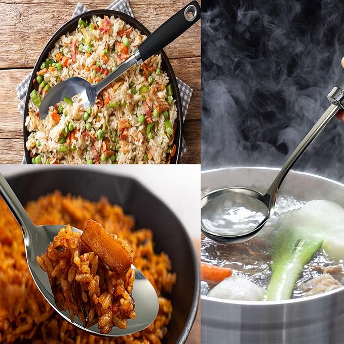 • 【3 Piece Serving Spoons Set】When you buy this stainless steel utensils set, you will get a slotted spoon, a cooking spoon, and a soup ladle, the serving spoon can be used to ladle soup or stir salad, the slotted spoon can be used to strain the soup, and the soup ladle can be used to ladle soup or stir the bisque. Thus, the 3 piece stainless steel serving spoons can fulfill your needs