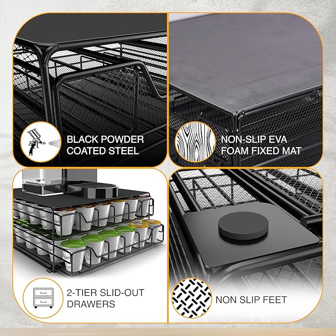 • - Safety Features: Comes with a removable non-slip mat to prevent sliding and other mishaps, ensuring your coffee essentials stay secure. Click 'ADD TO CART' for a two-tiered storage solution!