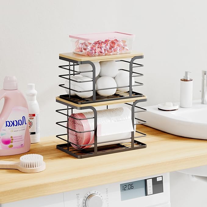 2 Pack Stackable Storage for Kitchen Laundry Pantry Organizers,Trash Bag Holder with Bamboo Top,Wall Mount Garbage Bag Dispenser,Black Large and Small