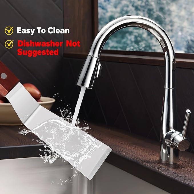 • Easy to Clean: Please clean with water and dry with a cloth after each use.It is not recommended for dishwasher cleaning,hand wash only.After cleaning,just put in a dry place to ensure styles durability.The stainless steel construction ensures longevity and easy cleaning, while the non-slip wood handle provides a comfortable grip and precise control.