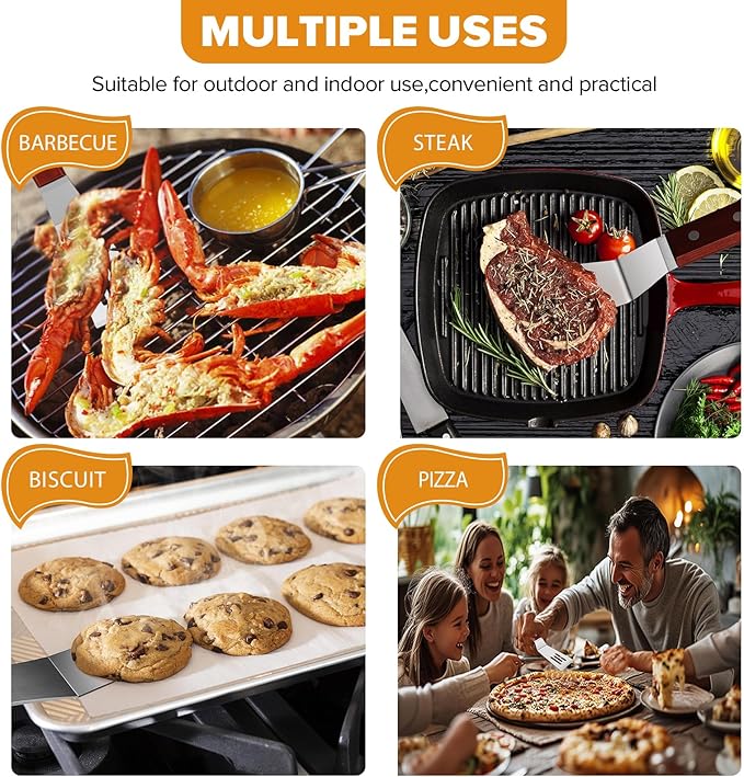 • Ergonomic Design: Professional Small Spatula Flipper sets,right size for small cast iron skillets.All stainless steel spatulas beveled edges are thin flexible and sharp to easily slip under food,perfect for flipping cutting serving during cooking baking.The wooden handle with 2 rivets and 1 hanging hole,add strength and provides a comfortable grip and insulation from heat.Convenient to hang up.