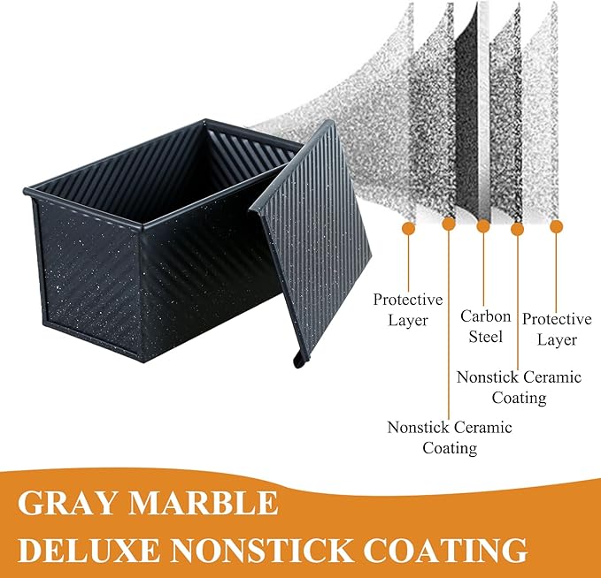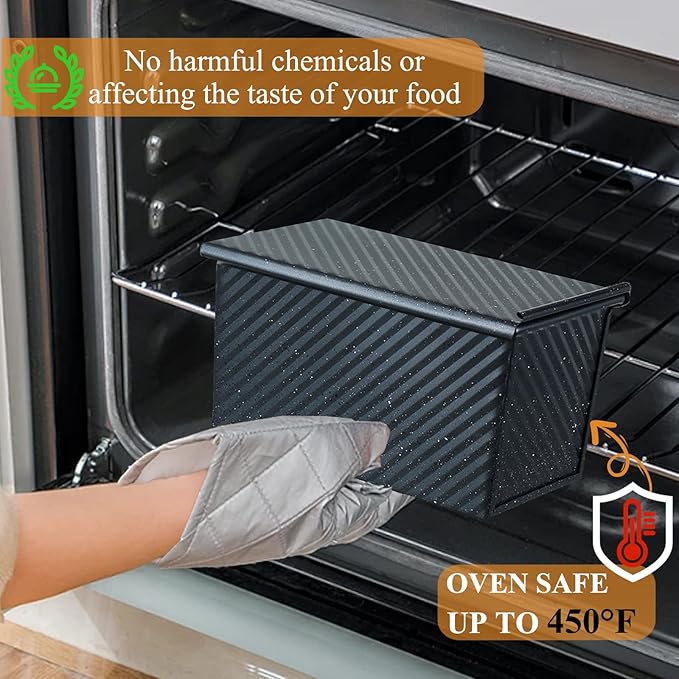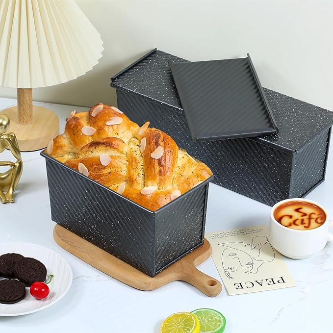 • DOUBLE CAPACITY, ENDLESS OPTIONS: Meet all your baking needs with 2 commercial-grade pullman loaf pans! The 12.5x4.8 inch pan handles 2.2lb dough for family-sized sandwich bread, while the 8.3x4.7 inch pan (1lb capacity) bakes personal sourdough loaves. Durable carbon steel construction withstands 450°F heat for even baking. Includes lids to lock freshness and shape perfect square loaves.