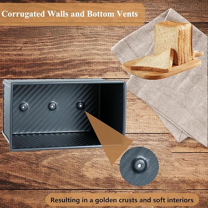 • PREMIUM QUALITY & EASY RELEASE: Food-safe nonstick PTFE/PFOA-free coating ensures effortless bread removal without residue. Corrugated walls and bottom vents enhance air circulation for golden crusts and soft interiors. Perfect for gluten-free, whole grain, or Japanese milk bread.