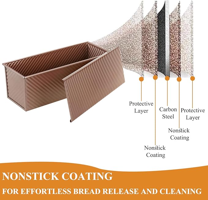 • PREMIUM NONSTCK & EASY CLEAN: Enhanced food-safe PTFE/PFOA-free nonstick coating ensures effortless bread release from bread pan with lid. It is perfect for baking sandwich bread, Japanese milk bread, gluten-free loaves, sourdough, and more.