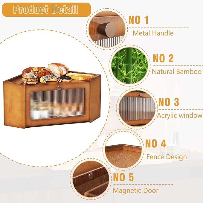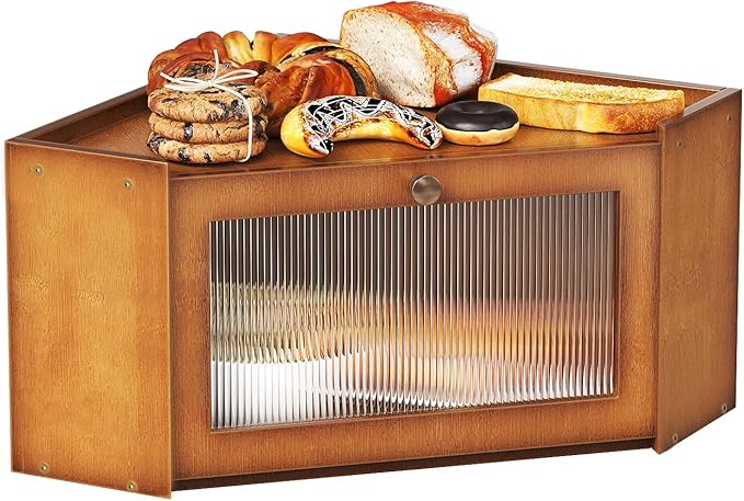 Corner Bamboo Bread Box for Kitchen Counter Large Capacity Rustic Bread Storage Container with Wavy Arcylic Transparent Door Vintage Storage for Homemade Bread (Brown)