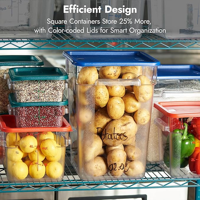 • Smart Space-Saving Design with Bold Graduations - Their square shape stores up to 25% more than round containers and stacks securely with lugs that prevent sliding. Bold Blue quart/liter markings ensure quick, accurate measuring, helping you manage bulk ingredients with confidence and efficiency.