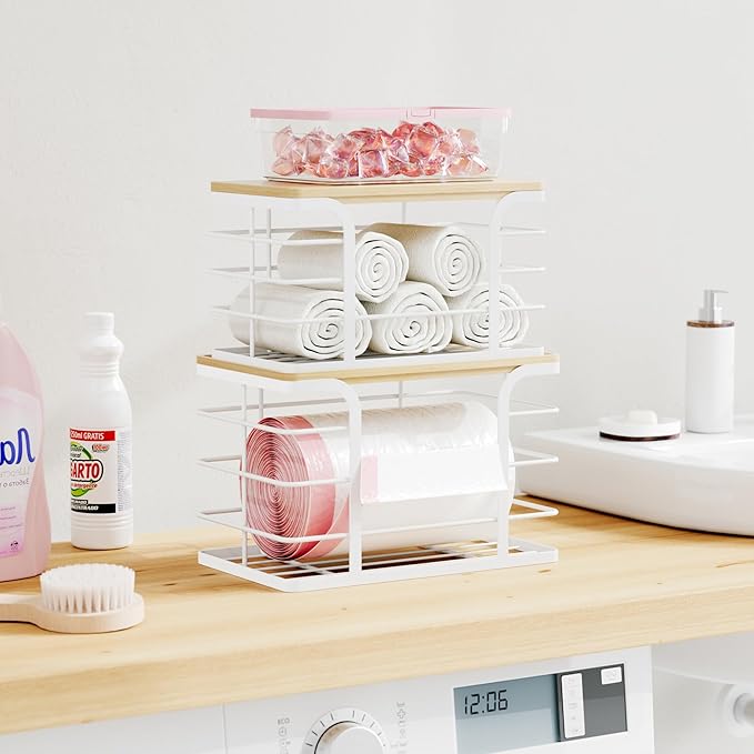 2 Pack Stackable Storage Kitchen Laundry Pantry Organizers,Trash Bag Holder Wall Mount,Garbage Bag Dispenser with Bamboo Top,White Large and Small