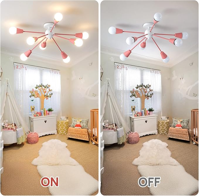 • Modern & Chic Style Design:This decorative kids ceiling light features eight pink radiating arms in a modern cross design,which is made of high-quality metal and is sturdy and not easy to bend.Sputnik style design adding chic elegance to home interiors.