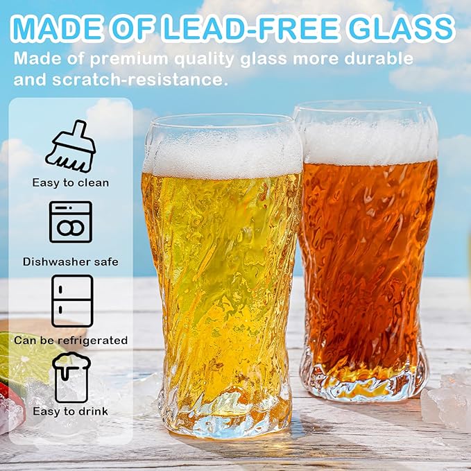 • Perfect Glass for Drinking Beer - The pint glass features a wide top and a narrow bottom, making it easy to hold while capturing the aroma and maintaining a frothy head.The shape of our wheat beer glass promotes faster carbonation, helping to retain the rich foam and natural flavor of wheat beer. It is the ideal vessel for wheat beer, lager, kegs, bitters, home brews, and more. These uniquely ripple designed pretty drinking glasses are extremely attractive!