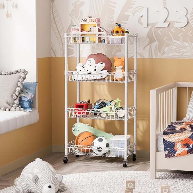 • Features: This shelf is designed with metal mesh baskets to prevent items from falling, each layer height is adjustable to accommodate items of different sizes, and it with wheels for easy mobility.