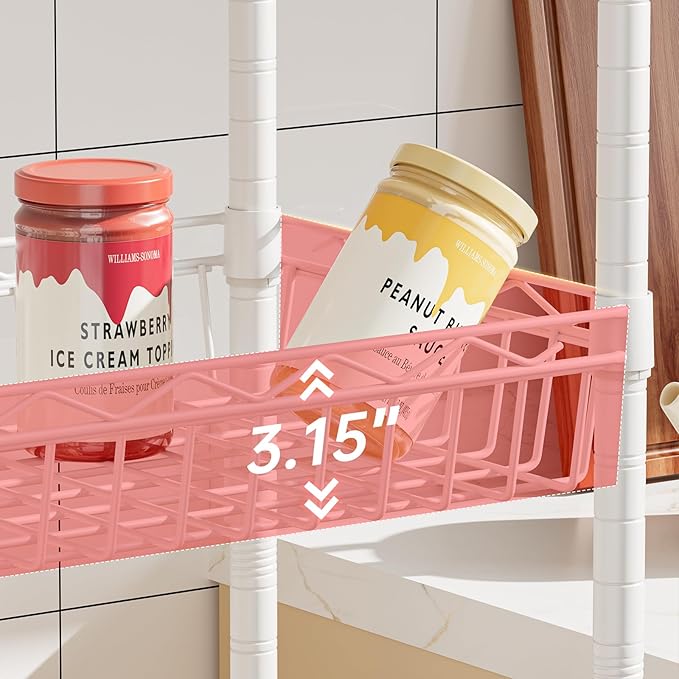 • Features: This shelf is designed with metal mesh baskets to prevent items from falling, each layer height is adjustable to accommodate items of different sizes, and it with wheels for easy mobility.