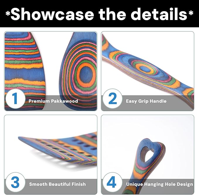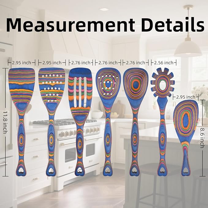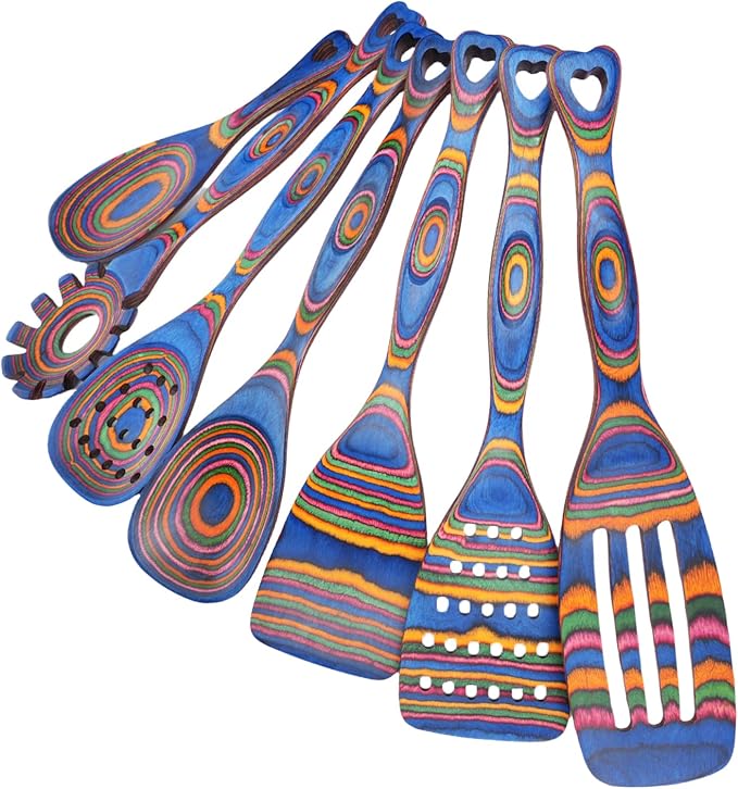 • 7-Piece Colorful Wooden Utensil Set: Natural hardwood construction with vibrant, organic color variations that add rustic charm to any kitchen. Safe for non-stick cookware and easy to clean