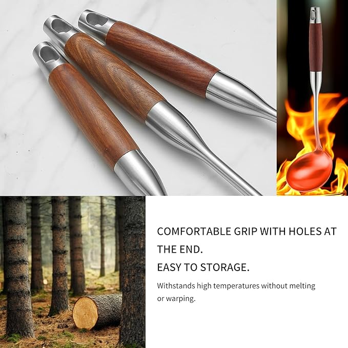 • 15inch Long Kitchen Utensil Set: Ergonomic design, idea weight, excellent grip. the unique grain of the rosewood handle is exceptionally beautiful, silky to the touch, and offers high heat resistance, the 15-inch length ensures that the chef's hands stay cool during everyday domestic or commercial use