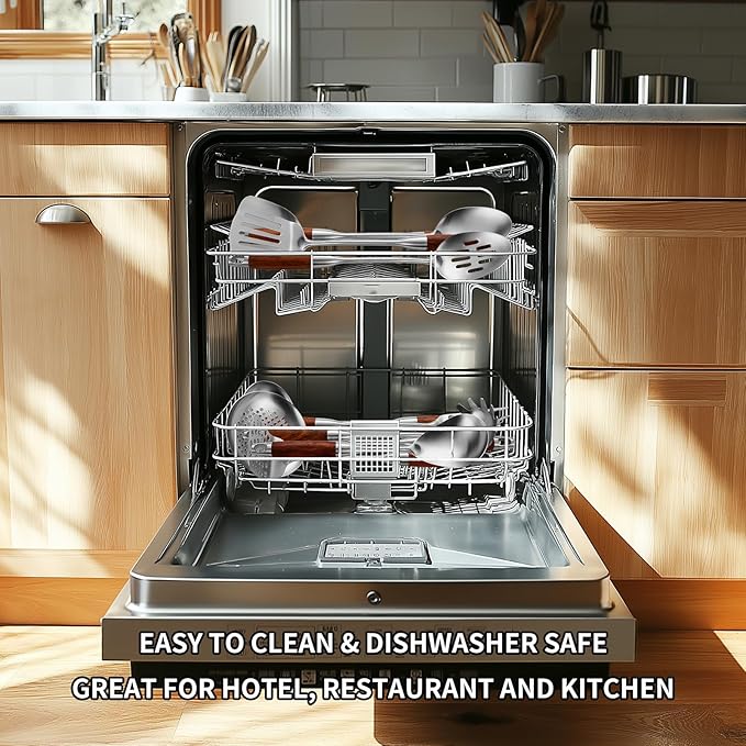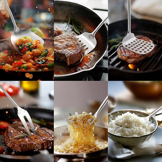 • Easy To Use and Store: The edges of the handle are rounded, smooth, and heat-resistant, so it won't burn your hands. With big hanging holes, easy to be hung to save space. our stainless steel cooking utensil tools can easily prevent dirt and grime from hiding, easier to clean. hand wash or dishwasher safe.