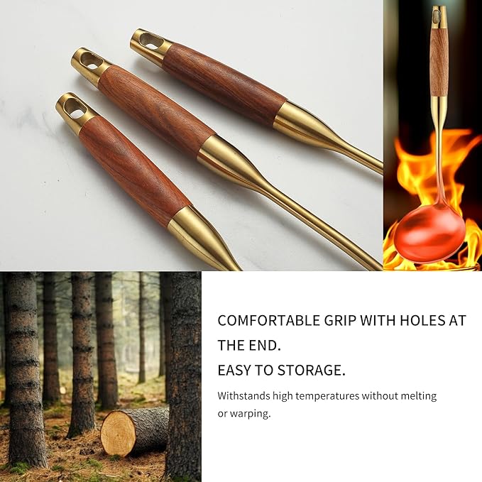 • 15inch Long Kitchen Utensil Set: Ergonomic design, idea weight, excellent grip. the unique grain of the rosewood handle is exceptionally beautiful, silky to the touch, and offers high heat resistance, the 15-inch length ensures that the chef's hands stay cool during everyday domestic or commercial use