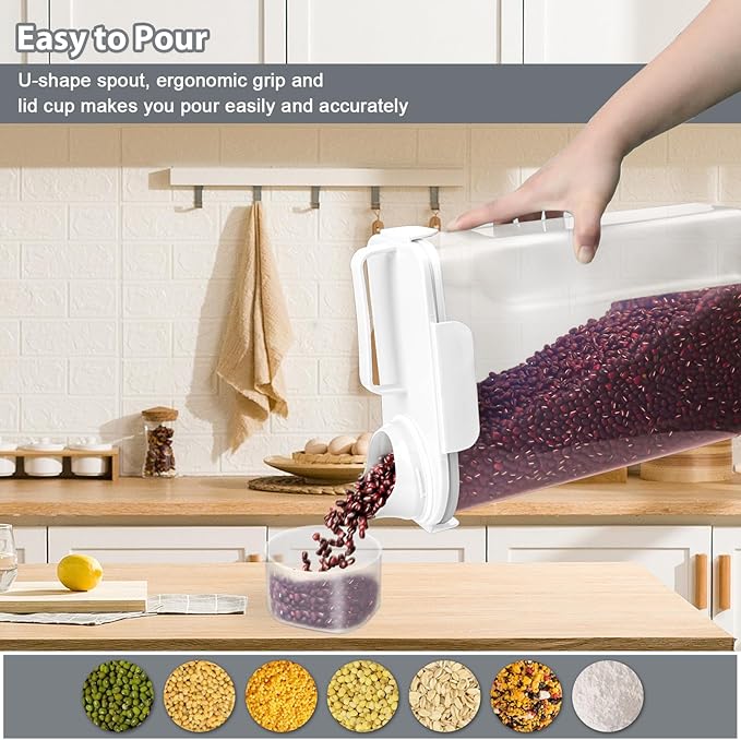 • 🥫【Airtight Seal Rice Storage】The airtight rice storage diepenser with featuring airtight 4 side-locking lid and measuring cup screw on over the pour spout, can protect food from moisture, ants and all bugs, and keep them dry and fresh. Say goodbye to stale and soggy food!