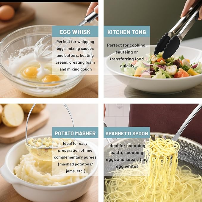 - 【Food grade Material】This cooking utensils set is made of premium stainless steel, which is heat-resistant, sturdy and rust resistance that provide you with long-term use. Unlike other plastic utensils that warp and melt under high heat or wooden tools that degrade over time, these cooking utensils are free of unhealthy substances-offering a durable and food-safe solution for everyday cooking