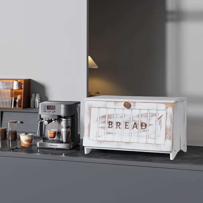 Bamboo Bread Box for Kitchen Countertop, White Vintage Wooden Counter Breadbox, Single Layer Rustic Wood Large Capacity Bread Storage Container Bin