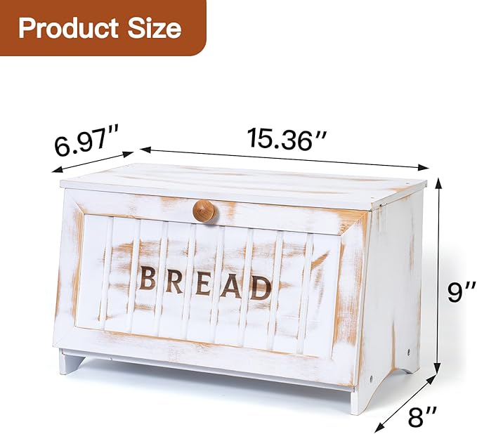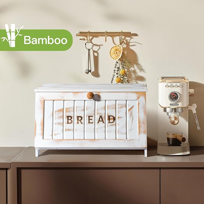 • STYLISH AND UNIQUE DESIGN: Crafted from high-quality bamboo with a hand-distressed finish, each bread bin boasts a unique vintage charm. Add a rustic farmhouse touch to your kitchen decor with this standout wooden bread box