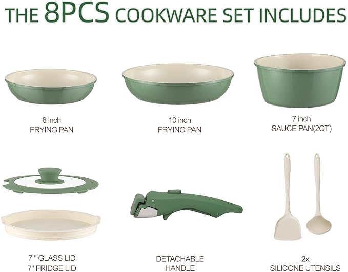 Ceramic Cookware Set Non Stick 8Pcs Pots and Pans Set Removable Handle Induction Kitchen Cookware Set with Frying Pans Oven Safe, Green