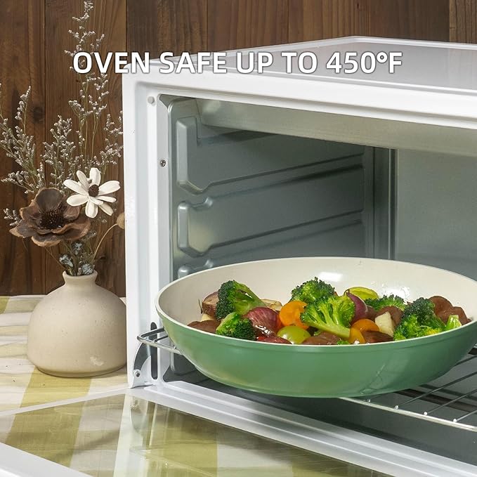 • Make Cleanup a Breeze- With innovative dual-sided coating design, our ceramic cookware set allows food residue to slide off with just an effortless wipe. The ceramic coating on the bottom makes cleanup much easier with simple wipes.It is also dishwasher-safe to free your hands after cooking