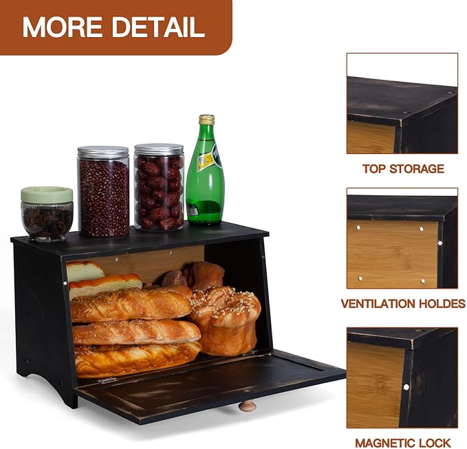 Bamboo Bread Box for Kitchen Countertop, Black Vintage Wooden Counter Breadbox, Single Layer Rustic Wood Large Capacity Bread Storage Container Bin
