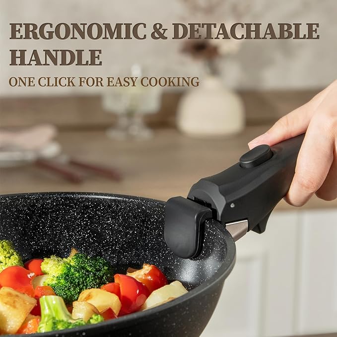 • Upgraded Detachable Handle for Easy Cooking- Adopting upgraded detachable handle, our pots and pans will be easily transferred with one “CLICK” from all kinds of stoves to oven, to grill, to fridge or onto the table. Notice: Overheating will cause discoloration. Please detach it when not in use while heating