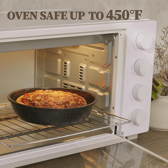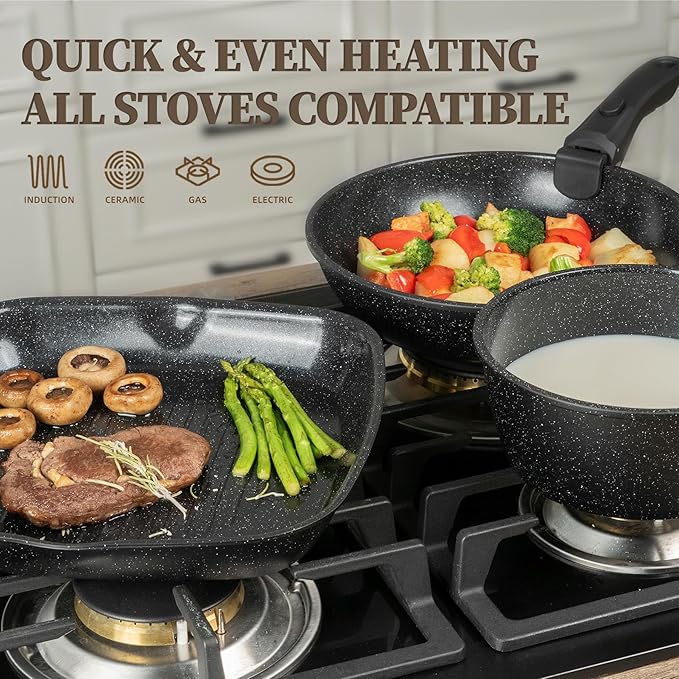 • Quick & Even Heating for All Stoves- Enhanced bottom secures quick and even heating to keep you away from hot or cold spots that undermine your dish or health by leaving some food overcooked and some undercooked. A high conductive base allows our nonstick cookware to work well on all cooktops, including induction, gas, electric, ceramic stoves and also oven safe up to 450°F