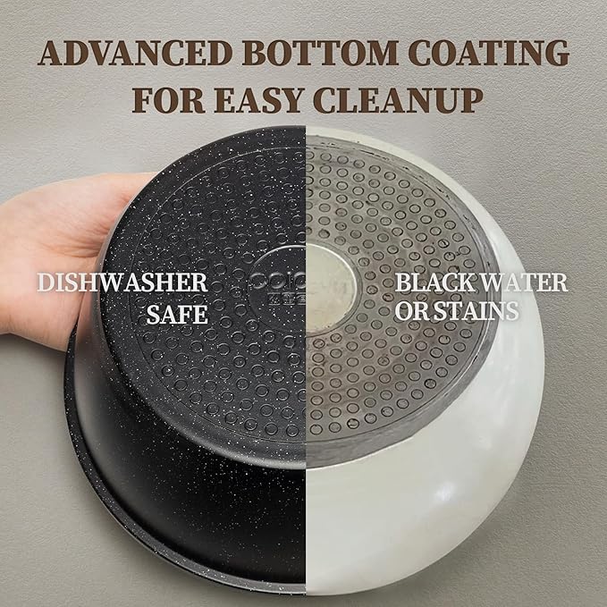 • Innovative Dual-sided Coating for Effortless Cleanup- The outstanding internal and exterior coating of our ceramic cookware set allows food residue to slide off with just an effortless wipe, making cleanup a breeze and saving you cooking time. Dishwasher-safe to free your hands after cooking