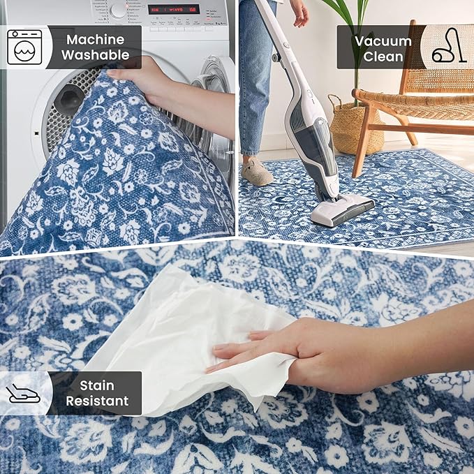 • Printed Blue and White Floral Rug with Subtle Greenish Hue: This small rug features a blue and white floral pattern, adding traditional elegance to any room. Ideal for traditional and modern interiors. Please note: slight color variations may occur due to lighting or screen settings, and the rug may appear lighter or with a turquoise or greenish tint depending on the light; This rug’s color is not as dark as navy blue