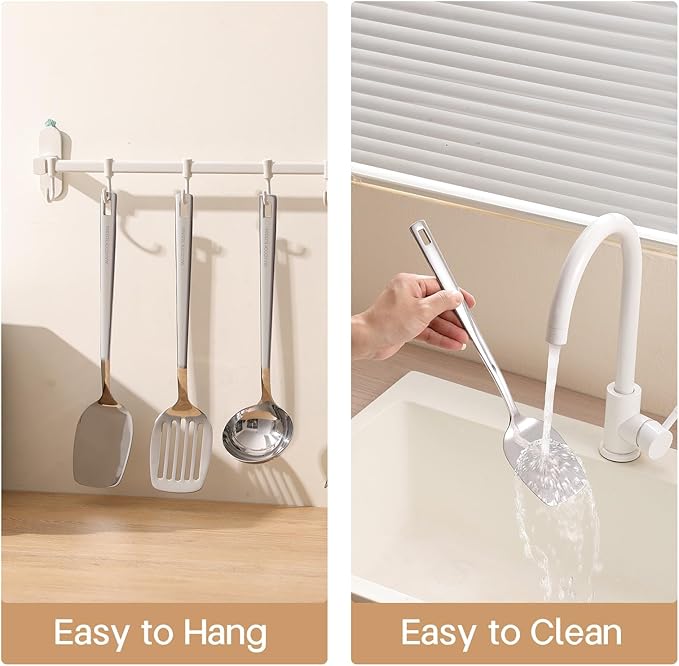 • 【Premium 18/8 Stainless Steel Construction】Crafted from professional-grade stainless steel cooking utensils, our metal kitchen utensils set features superior corrosion resistance that withstands years of kitchen use. The seamless one-piece design makes this frying pan spoon spatula set the safest choice for handling hot food