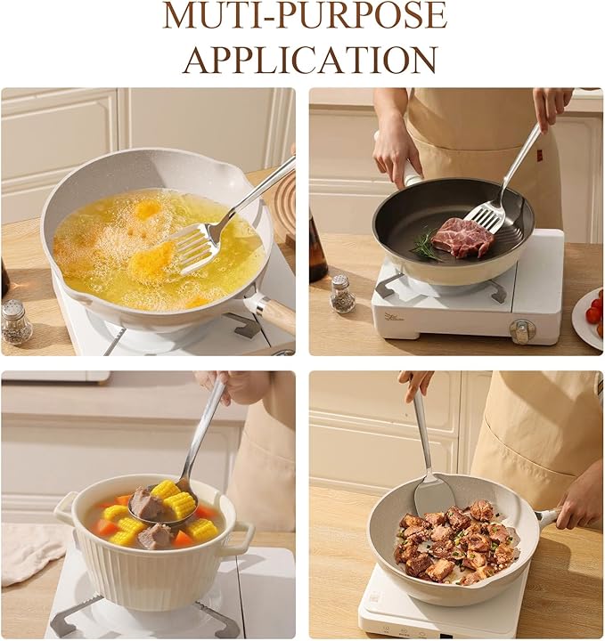 • 【Widely Used】Our stainless steel kitchen utensils set is a great gift for the chef in your life, widely used for searing, sauteing, stir-frying, braising, deep-frying, stewing and cooking meat and vegetables. Also perfect as a gift choice for housewarming, Mother's Day, Valentine's Day, Thanksgiving, Christmas, birthdays, weddings and other occasions