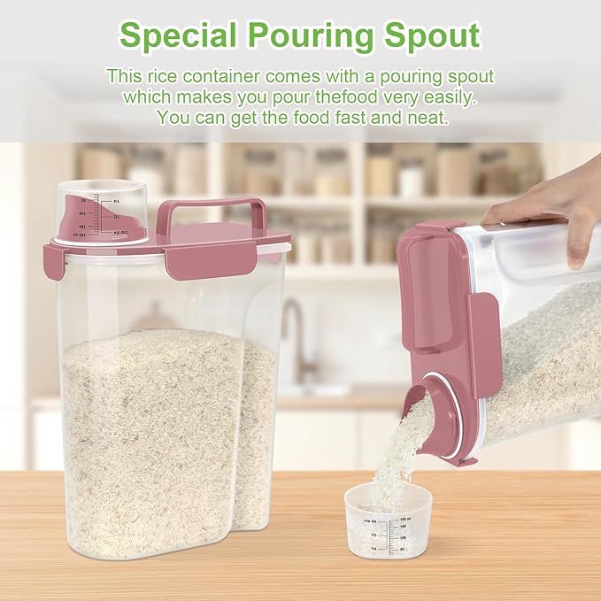 • UPGRADED EASY-POUR LARGE SPOUT: This rice Bin features a large pouring spout to easily dispense your ingredients. Its ergonomic design provides a comfortable grip for easy one-handed pouring.rice storage containers Slim compact and space-saving