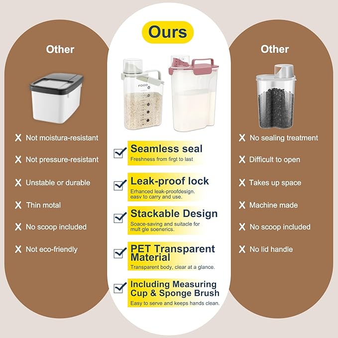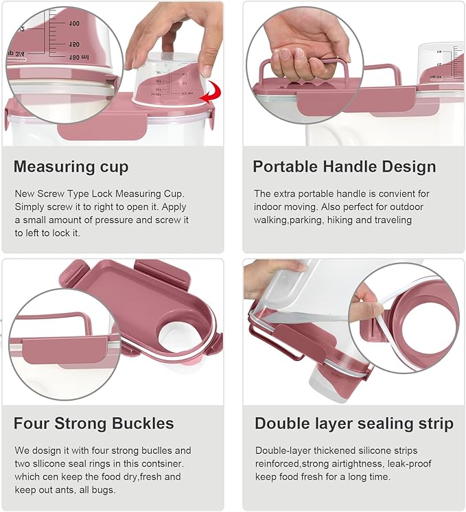 • CLEAR RICE HOLDER:The clear pet food container allows you to identify the contents at a glance,clear visibility and better organization.the cereal dispenser will keep your kitchen pantry neat and organized.there is also a portable handle for easy movement and going out