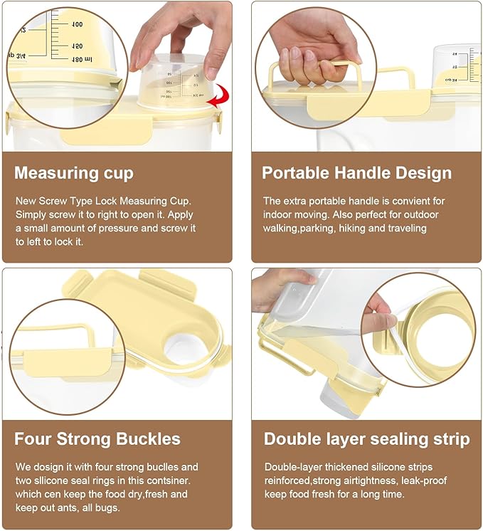 • CLEAR RICE HOLDER:The clear pet food container allows you to identify the contents at a glance,clear visibility and better organization.the cereal dispenser will keep your kitchen pantry neat and organized.there is also a portable handle for easy movement and going out