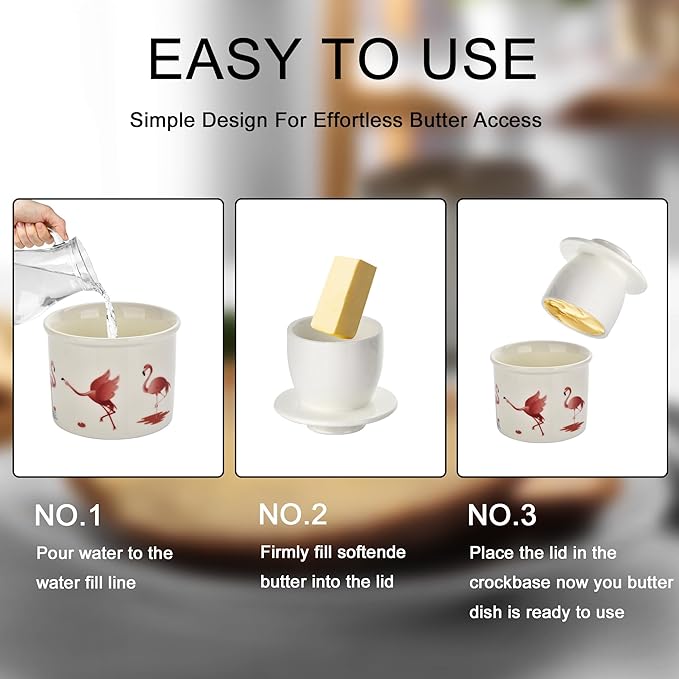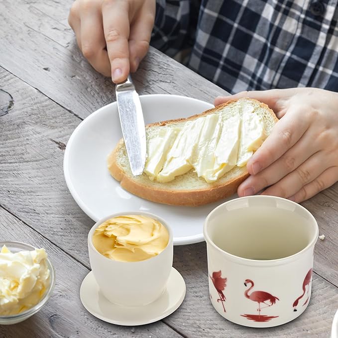 • A Super Cute Flamingos PATTERN - Designed passionate Flamingos lovers , FARMHOUSE butter keeper consists of an inverted can shaped lid and jar base,cute flamingos animal printed on the body of the butter crock, it looks elegant, simple and fashionable.This butter dish with lid for countertop is an excellent choice for your kitchen accessories,A chic gift that will leave your foodie friends and family happiness.