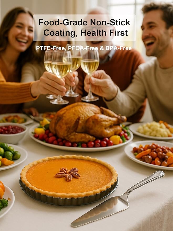 10 Inch Round Quiche Pans with Pie Cake Server. Removable Bottom, Non-Stick Coating, Rugged Carbon Steel for Tart Quiche Pie Baking. Gift for Women Wife Christmas Thanksgiving Party Festival
