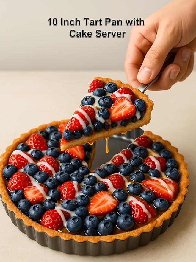 • 【PACKAGE & GUARANTEE】 1 * 10in Round Tart Pans, 1* 8.9in Pie Sever. We are aim to provide our customers an outstanding service and make sure you are completely well-pleasing with your purchase. If you are not happy with what you get, just contact us directly for service.