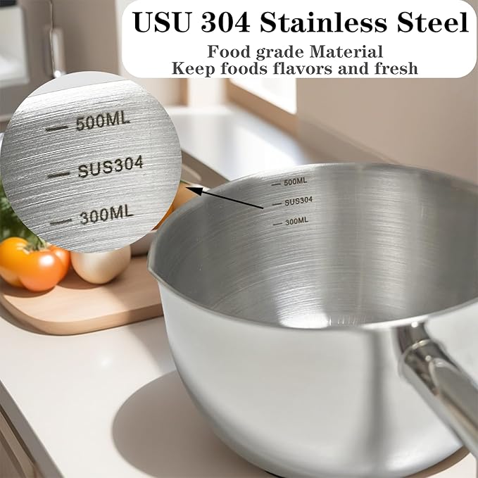 • 3-layer thickened material: This Butter Warmer Pot adopts a 3-layer composite design: 304 stainless steel inner layer, aluminum core thermal conductive layer in the middle and stainless steel outer layer, whether used as Milk Pot for stove or butter melter, it conducts heat quickly without deforming