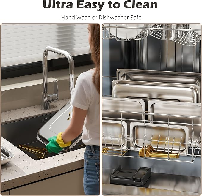 - Stainless Steel Durability: Crafted from premium stainless steel, these chafing dishes are built to last. They maintains their elegant appearance even after frequent use. The stainless steel construction also provides excellent heat retention, keeping food at the perfect serving temperature, either warm by fuel heating or cool by iced. You can rely on this set for many parties and events to come