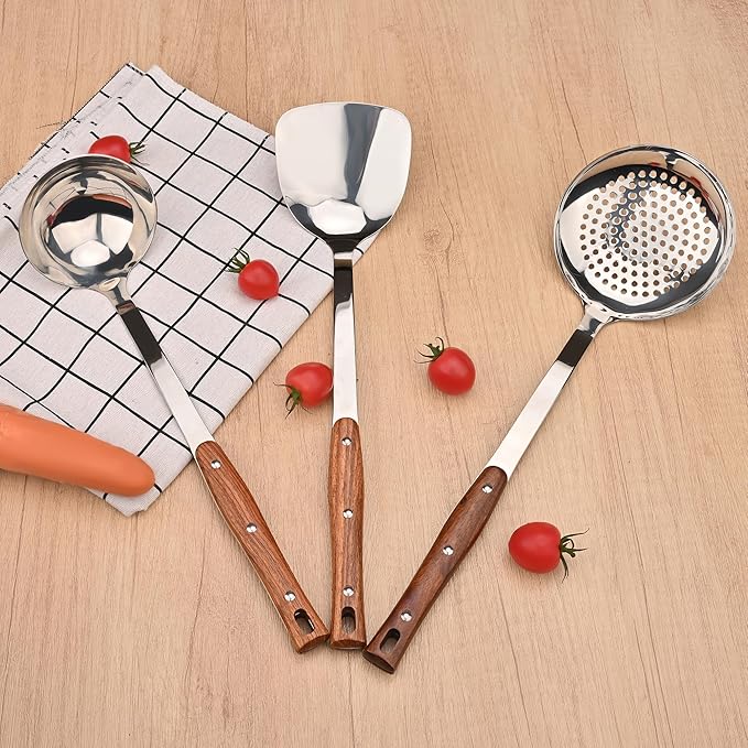 • Package Includes: This stainless steel wok tools include wok spatulas and metal ladle and a skimmer spoon, great for cooking, soup, drainning and turning a variety of foods with ease.