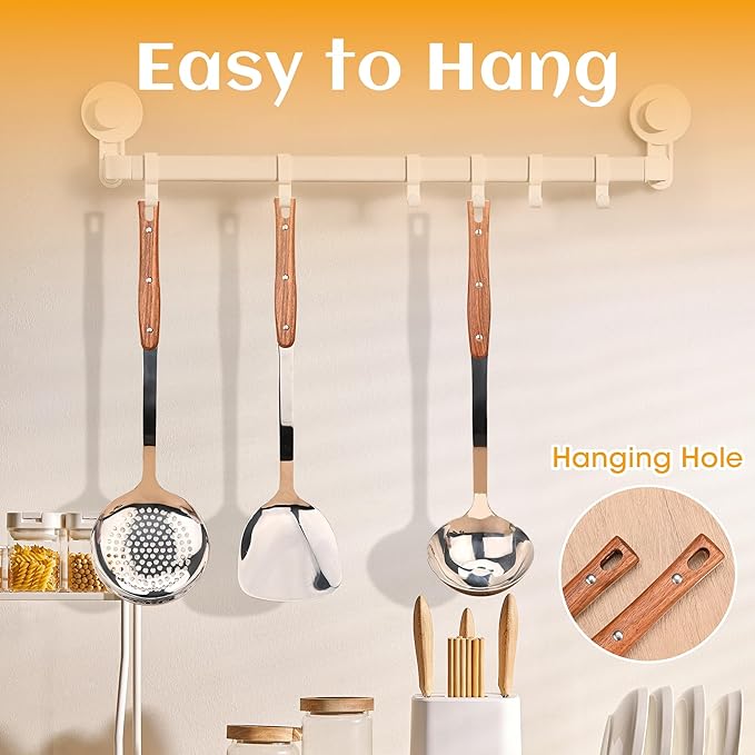 • Easy Cleaning & Space-Saving Storage: All wok tools are dishwasher-safe for quick cleanup and has haning holes, accessible storage—keeping your kitchen tidy while saving drawer space.