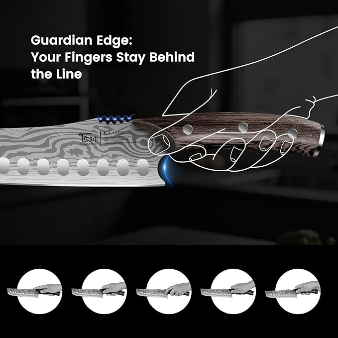 • 1 HANDGUARD, 0 COMPROMISE ON SAFETY—The thoughtful guarded grip design, prevents the hand from sliding towards the blade, as a special structure between the blade and the handle, is the perfect combination of craftsman aesthetics and mechanism safety suits both left/right-handed users, even wet foods such as tomatoes, can be confidently sliced