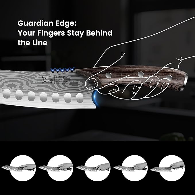 • 1 HANDGUARD, 0 COMPROMISE ON SAFETY—The thoughtful guarded grip design, prevents the hand from sliding towards the blade, as a special structure between the blade and the handle, is the perfect combination of craftsman aesthetics and mechanism safety suits both left/right-handed users, even wet foods such as tomatoes, can be confidently sliced