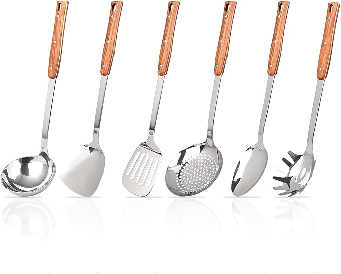 FJNATINH Wok Utensils Tools - 6 PCS Stainless Steel Kitchen Cooking Utensils Set, Include Wok Spatula, Soup Ladle, Skimmer, Spaghetti Server, Slotted Turner and Solid Spoon, Heat Resistant