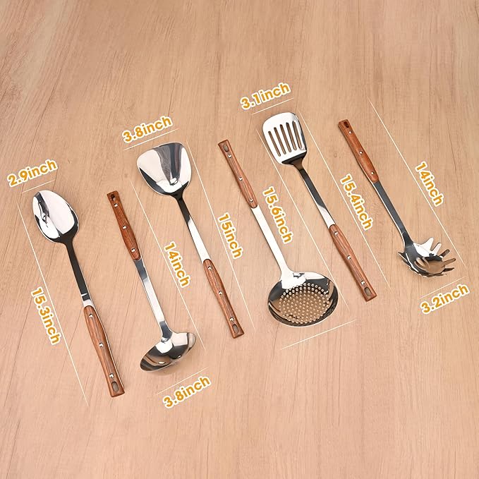 • Complete Kitchen Essential Set: Includes 6 metal kitchen tools (slotted spoon, solid spoon, slotted turner, solid turner, Spatula, and ladle spoon) to handle frying, cooking, soup, baking, and serving